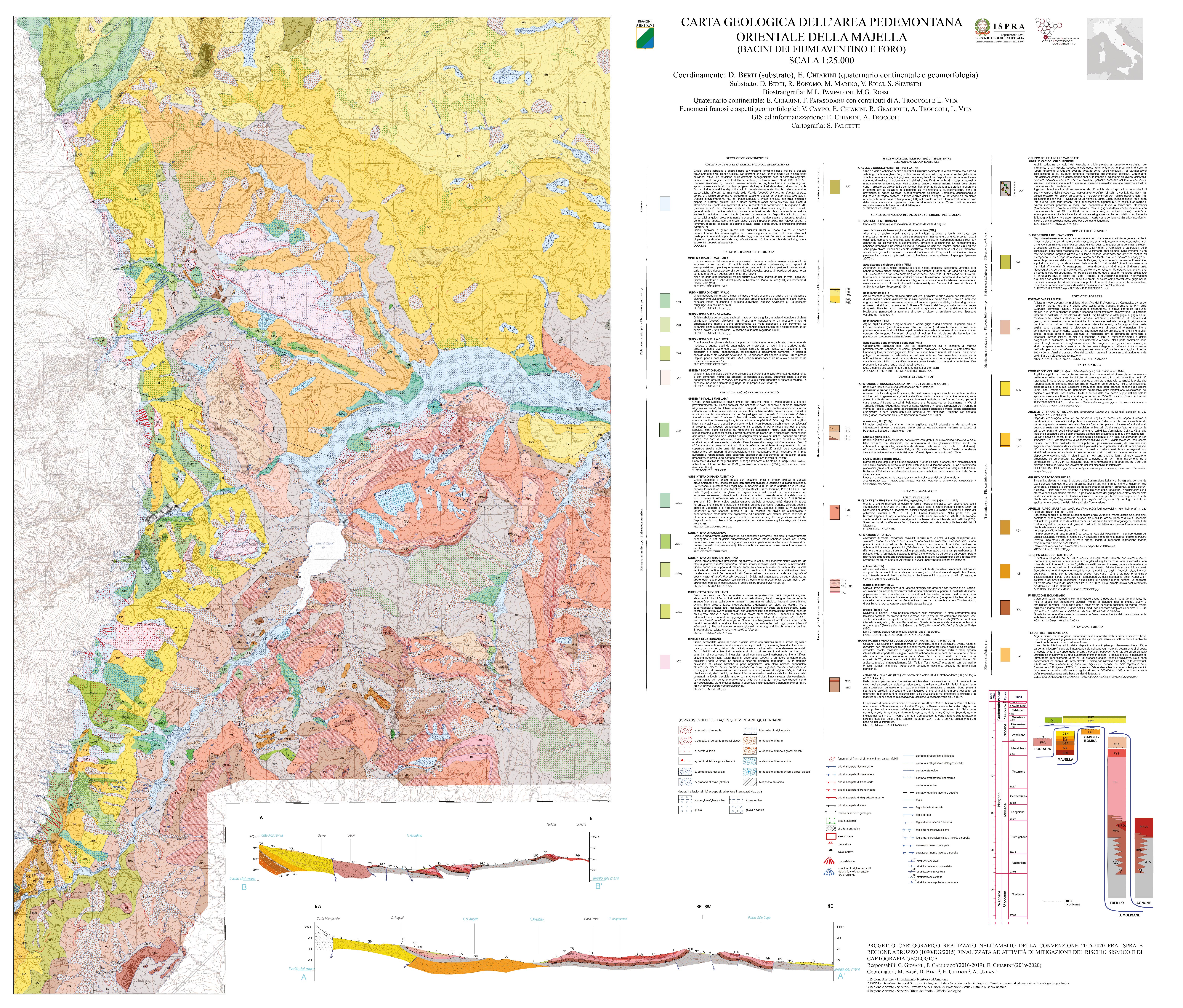 \n\nThe map depicts an area of the outermost sector of the central Apennines to the east of the Majella carbonate massif, in the catchment areas of the Aventino and Foro rivers, where prevalent terrigenous deposits and the allochthonous Molise succession, as well as Quaternary marine and continental deposits crop out.
